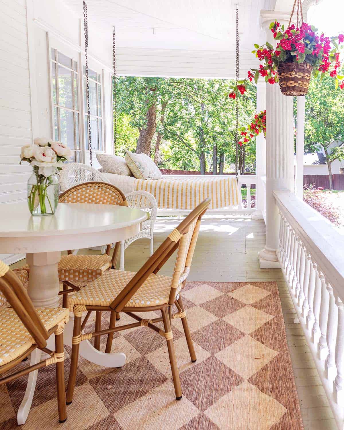 Sources: Patio Rug, Round Table, Bistro Chairs, Hanging Plant (similar), White Chairs.