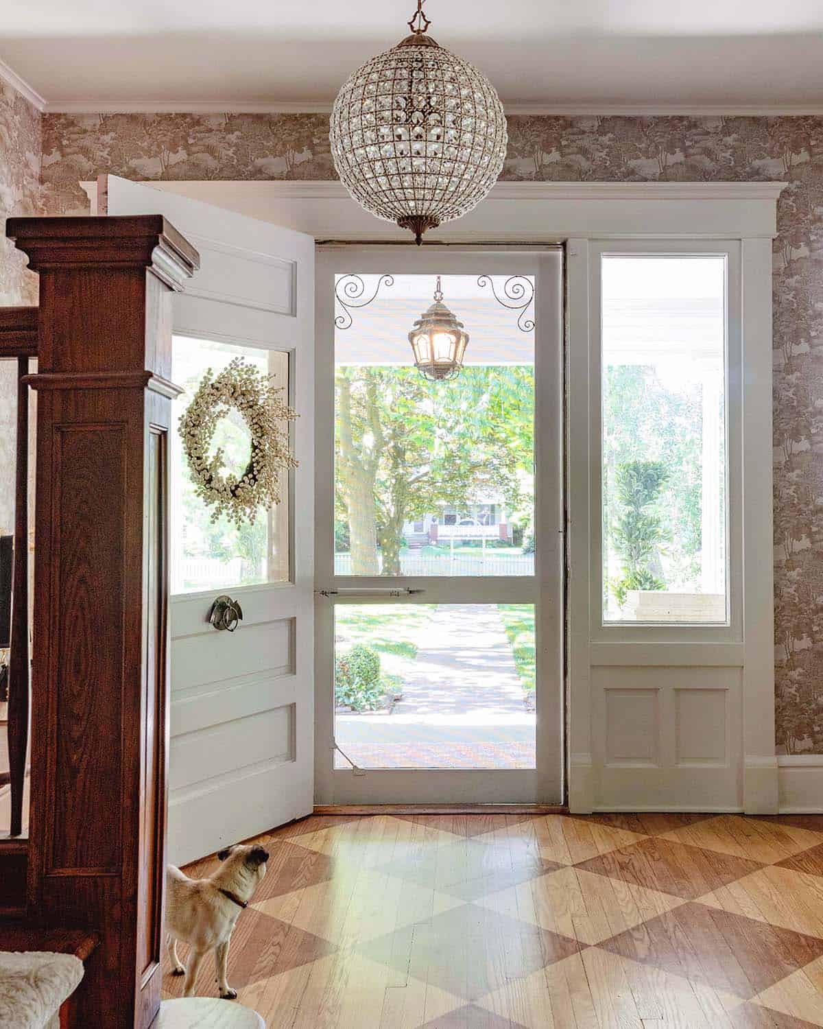 Entry – From this angle, you can’t see that the other side of the door is a warm pink, but you can see my bat door knocker. And our cute little pug, Pumpkin.