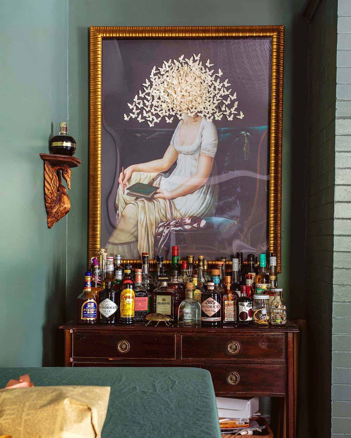 Bar Cart – I currently work as a cocktail writer most weeks (see our cocktail recipes) and in doing so for more than a year I have amassed a huge liquor collection. It’s split between here and the dollhouse bar (below). Learning new cocktail recipes is one of my passions. I found this art piece at Scout Design Studio and the wooden swan shelf is an eBay find.