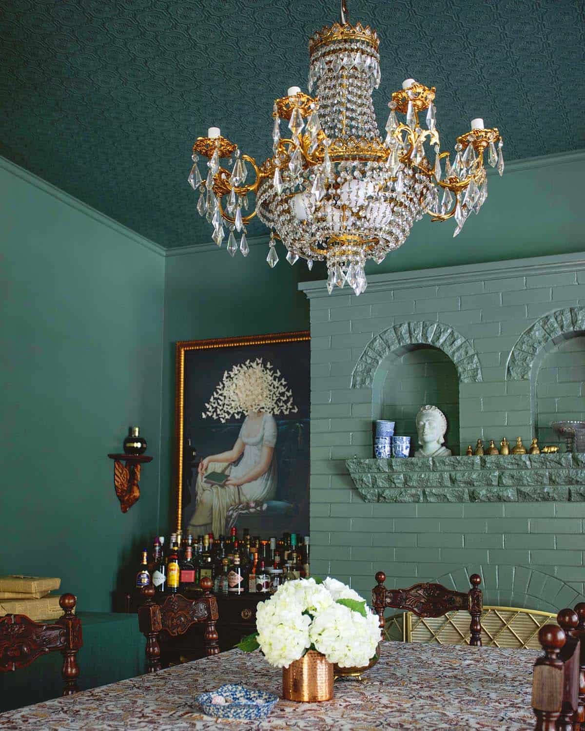 Powder Bathroom – Our powder bathroom on the first floor is the one most often seen by guests so I decided to go all-in—filling it with paintings from floor to ceiling. The woman in the center-right in the yellow blouse is my grandmother Corina and for sure she’s the inspiration for the whole space.