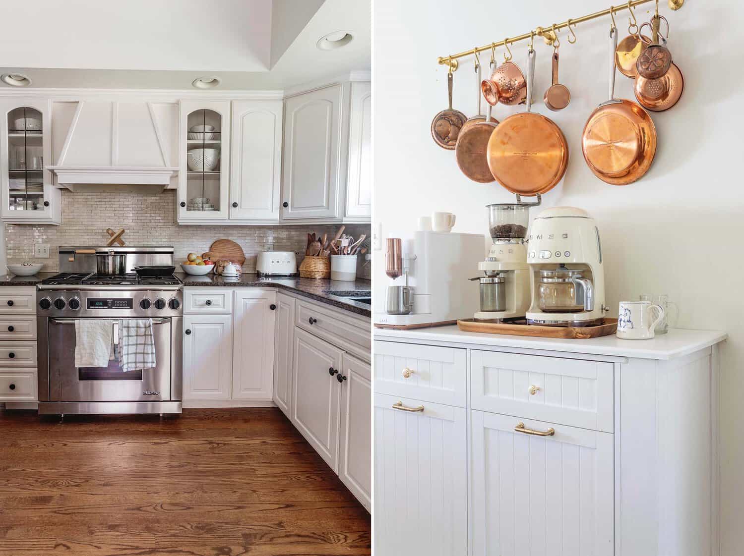 Hidden Trash Can – Here you can see the part of the kitchen we kept as is, and a solution we came up with to make it more functional for phase one. We added this double trash can and built out the counter to make it deep enough to accommodate our coffee gear. Above that, I added a brass pot rail to store our copper pots.