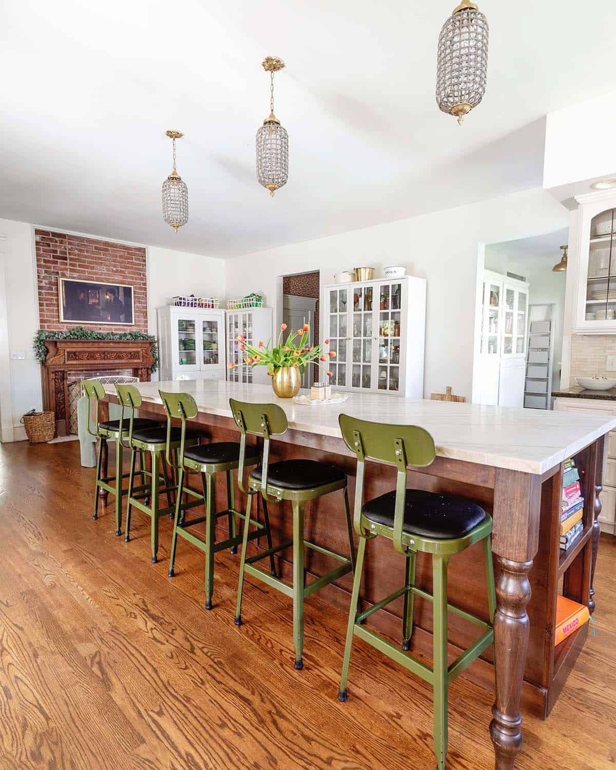 Kitchen Island – Our kitchen is the main room we have not renovated, aside from matching the hardwoods and adding this 10-foot island. I found the green stools from Schoolhouse Electric. I am mulling over design ideas slowly and we plan to complete it in the next few years.