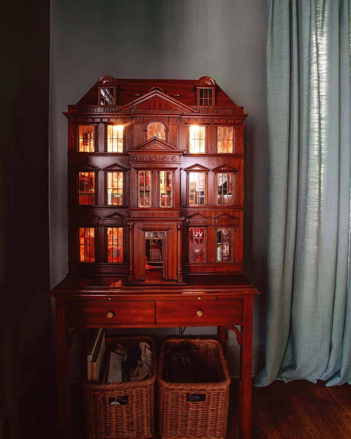 Dollhouse Bar Cabinet – The dollhouse bar has a fun story behind it. One night, I was rewatching my favorite movie “Knives Out,” and I noticed that the giant dollhouse in his living room was actually a bar. I looked them up immediately finding that they run between $6,000 and $20,000 (I know, right??!). The next day, I found one on an estate sale auction and was able to win it for a fraction of the retail price. To me, this is the best evidence I’ve found that we’re living in a simulation designed in our imaginations. Dream big, dream weird, friends! I’m kidding/not kidding.