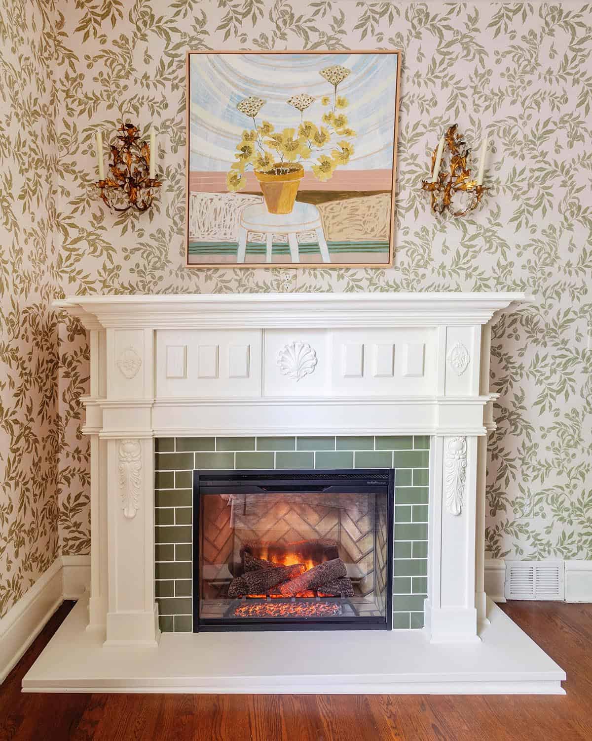 The biggest departure we took from the movie design is instead of a black marble surround I chose a tile that coordinated with our wallpaper. We used Fireclay Tile in the color Peabody.
