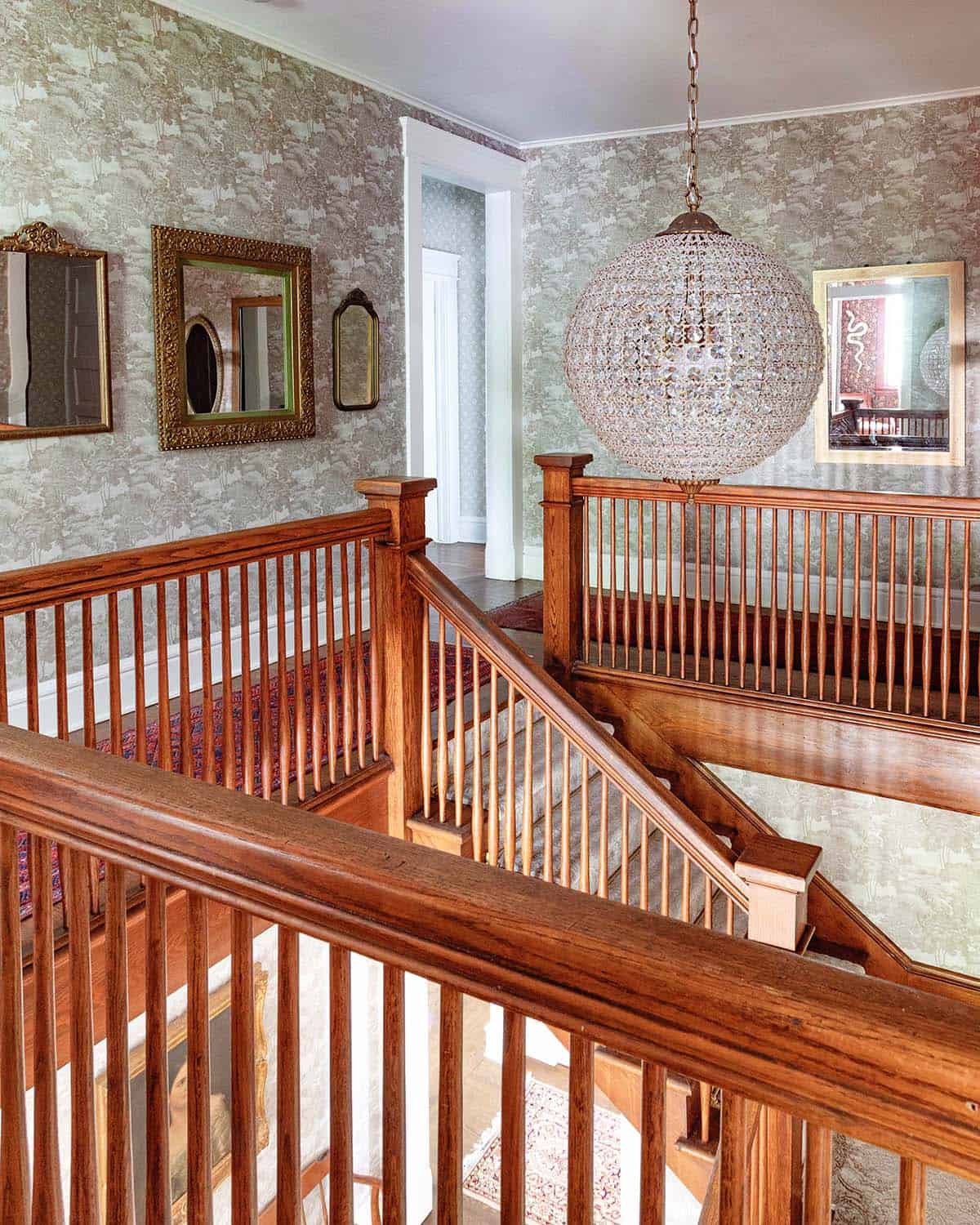 Stairway Landing – Now, we’re moving up to the second floor. This landing at the top of the stairway goes all the way around to access our bedrooms, the laundry room and my office. I decorated it with vintage mirrors all the way around.