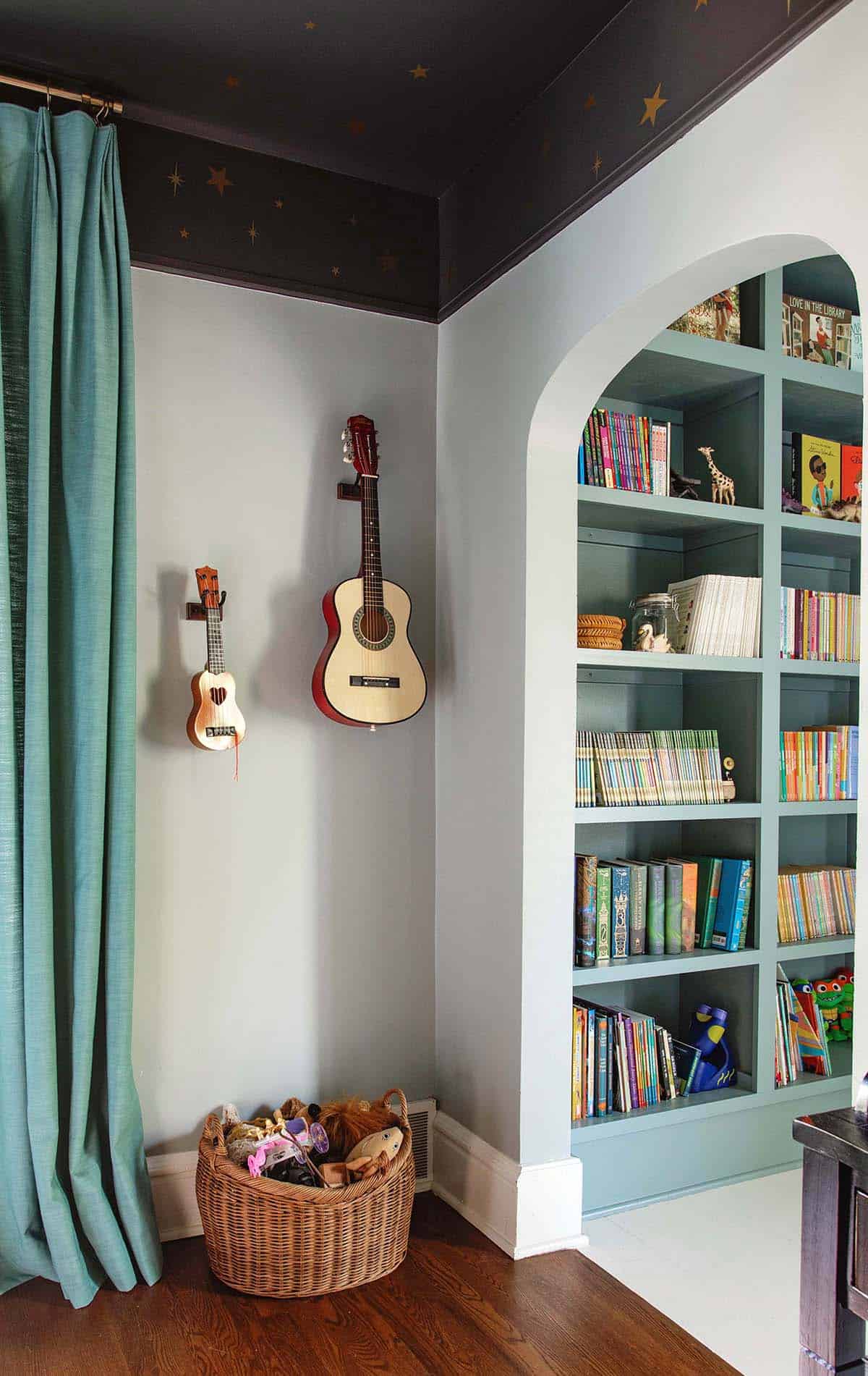 This photo shows my favorite peek through of the house with a floor to ceiling kids library for our 8-year-old daughter.