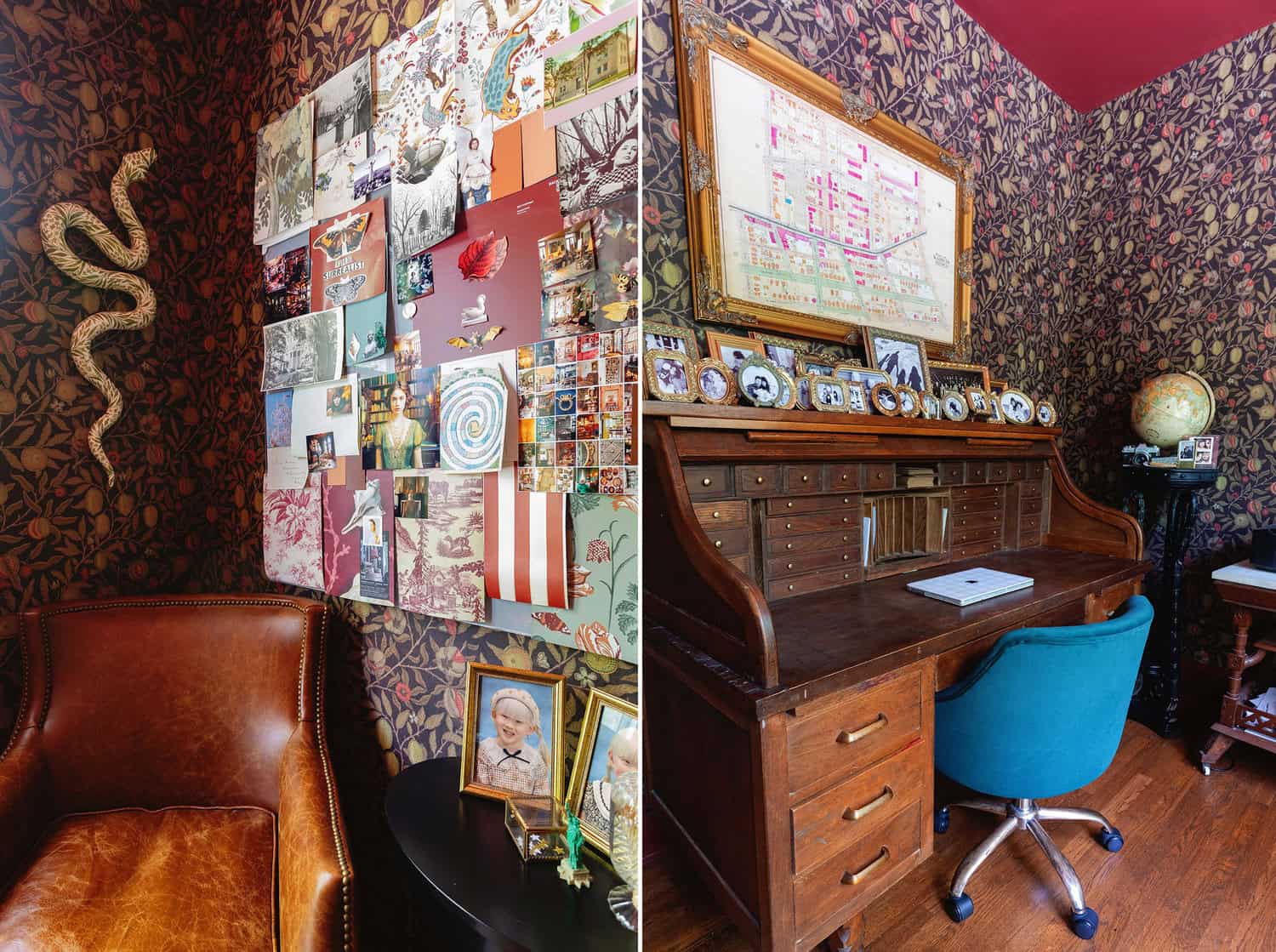 Moody Office – My office is the most moody space in our home and since it’s a very small room, the wallpaper and intense red paint color made a huge impact. I found this rolltop desk from Marketplace.
