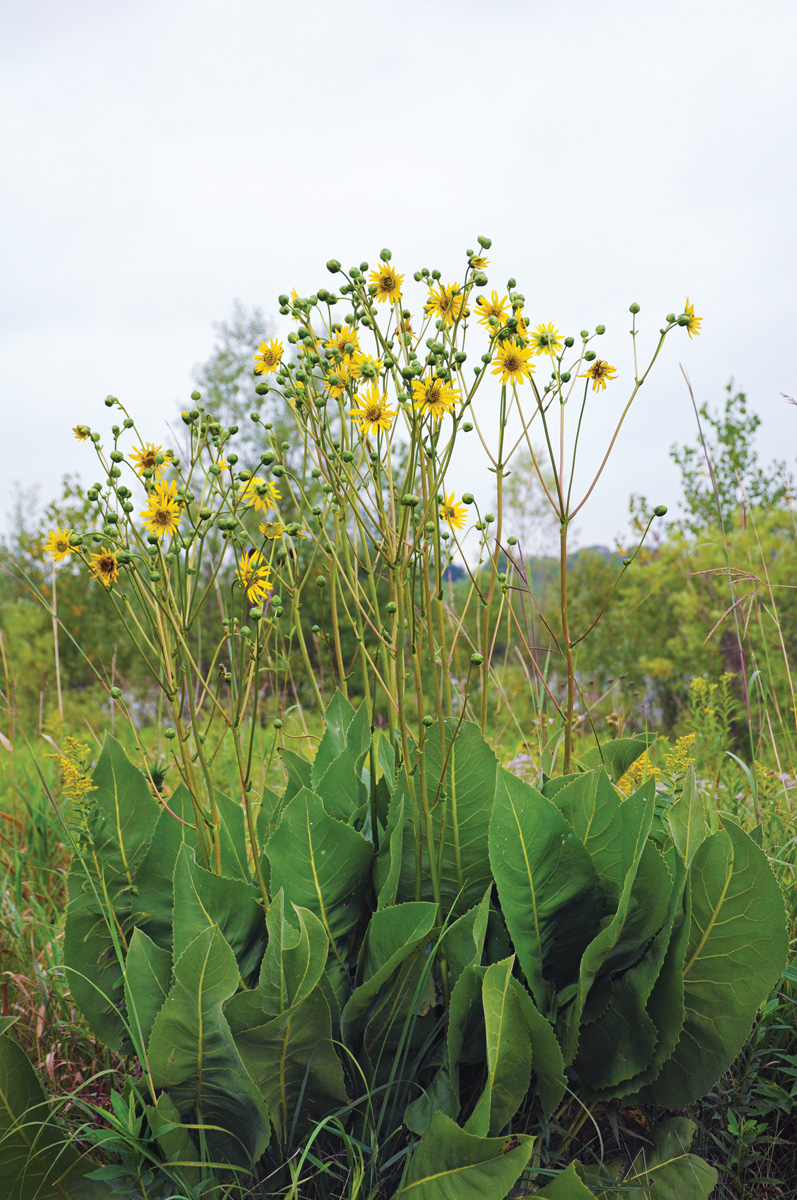 As a budding horticulturist, my first encounter with prairie dock (Silphium terebinthinaceum) was intriguing and puzzling. The sheer size and verticality of the spade-like leaves slicing through grasses and forbs captured my imagination, and while its place in the University of Wisconsin’s Curtis Prairie provided a clue to its nativity, its identity was a mystery. Over the ensuing years I came to know prairie dock well, thanks to its prominent position in certain naturalistic areas at the Chicago Botanic Garden. It honestly delights me in every season. From the unfurling spring-green foliage to the brown autumnal leaves, twisting and curling on themselves, to the starkness of the dark, wizened husks poking through a crystalline snowfall, I love this plant. To this day, the sight of its sunny daisies anchored by the prodigious foliage is both nostalgic and heartening.