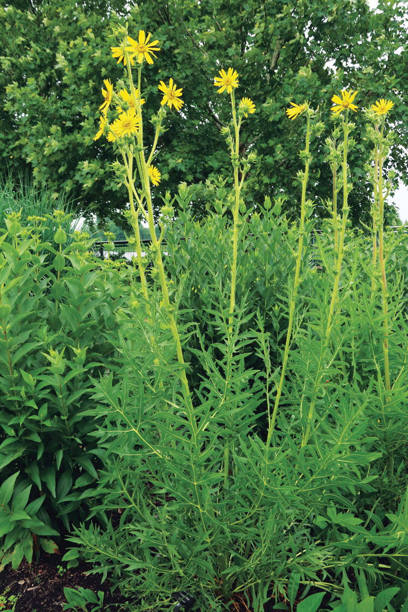 The smaller stature of Mohr’s rosinweed (S. mohrii) will appeal to gardeners who might be nervous about its bigger cousins. At 5 feet tall and 4 feet wide, it was one of the shortest rosinweeds in the trial. For nearly three months, beginning in early summer, abundant 2-inch pale yellow flowers put on a nice show (photo p. 48). Their light almond or vanilla scent is an unexpected treat that people and pollinators adore. Mohr’s rosinweed is noticeably fuzzy all over—more so than any other species—making the green leaves, stems, and phyllaries look grayish (photo p. 56, bottom). Unfortunately, it has a messy downside—the withered ray florets fall and cling to the fuzzy leaves as does other organic debris. Mohr’s rosinweed is a prairie native in Tennessee, Alabama, and Georgia, but has been fully hardy in the upper Midwest. The bushy habit can be softened by billowy asters, catmints (Nepeta racemosa and cvs., Zones 4–8), and grasses, both short and tall.