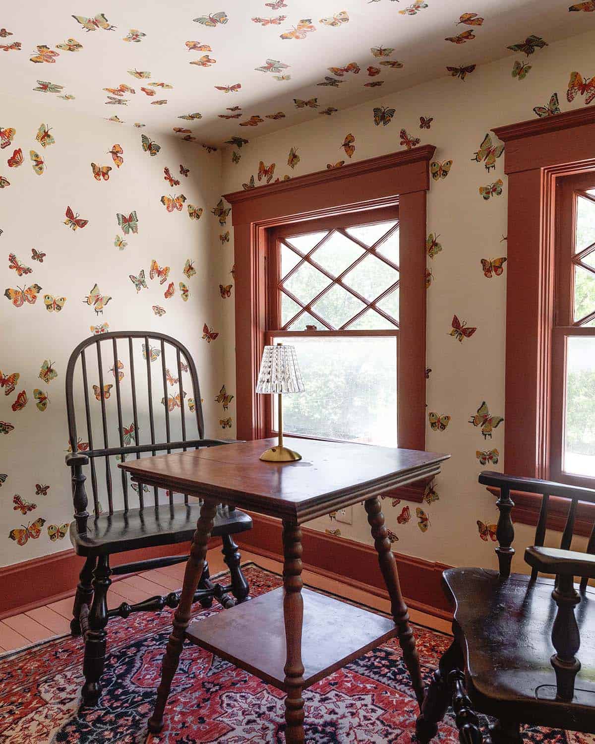 Butterflies Wallpaper in Parchment. This window little nook is on the third floor in our home library. The entire room is painted the moody trim color (including the ceiling) except for this nook. Originally, I thought about doing a mural in this space, but then I fell in love with this butterflies pattern and the rest is history! I’m absolutely in love with it!